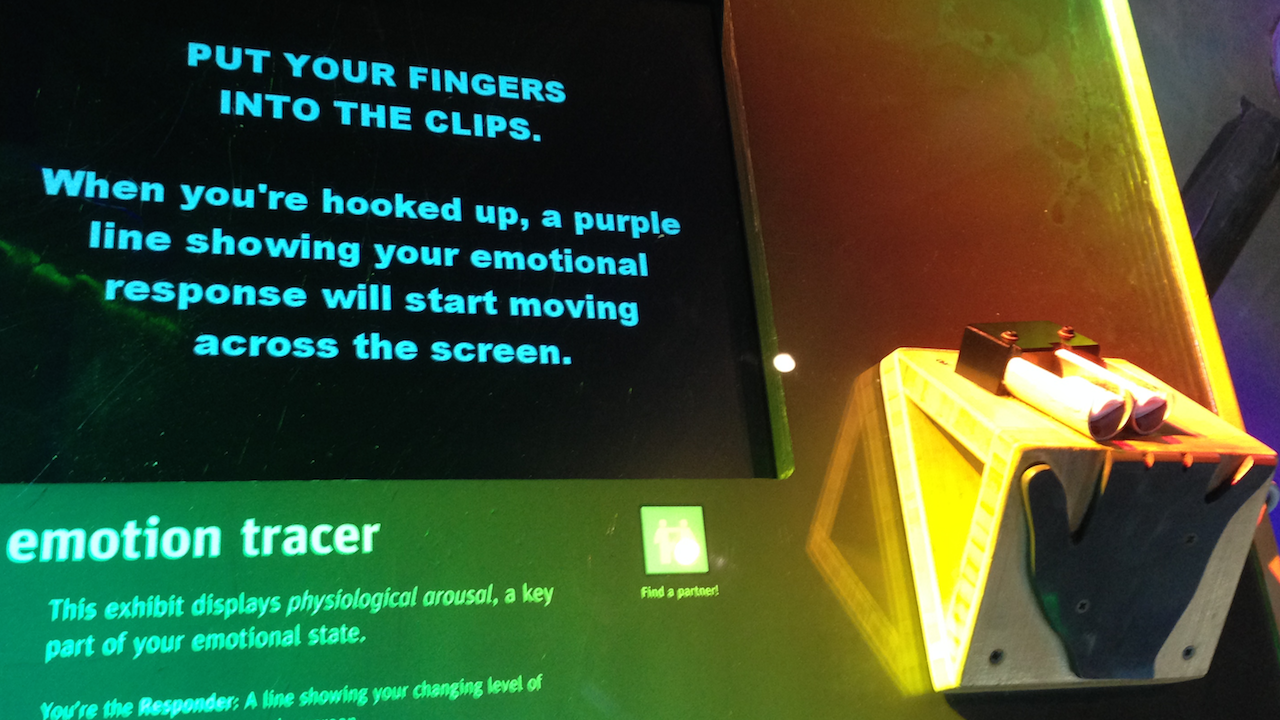 This exhibit is about how emotion lives in the body—and how easily it can be sparked in everyday social interactions. One visitor wears a sensor while another asks them emotionally provocative questions. Their physiological arousal shows up live on a screen, measured using electrodermal response (EDR).